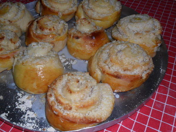 Com um rolo, estique a massa. Coloque o recheio e enrole a massa como um rocambole. Corte na largura de uns 2 dedos. Coloque em uma assadeira untada os pedaços em pé.